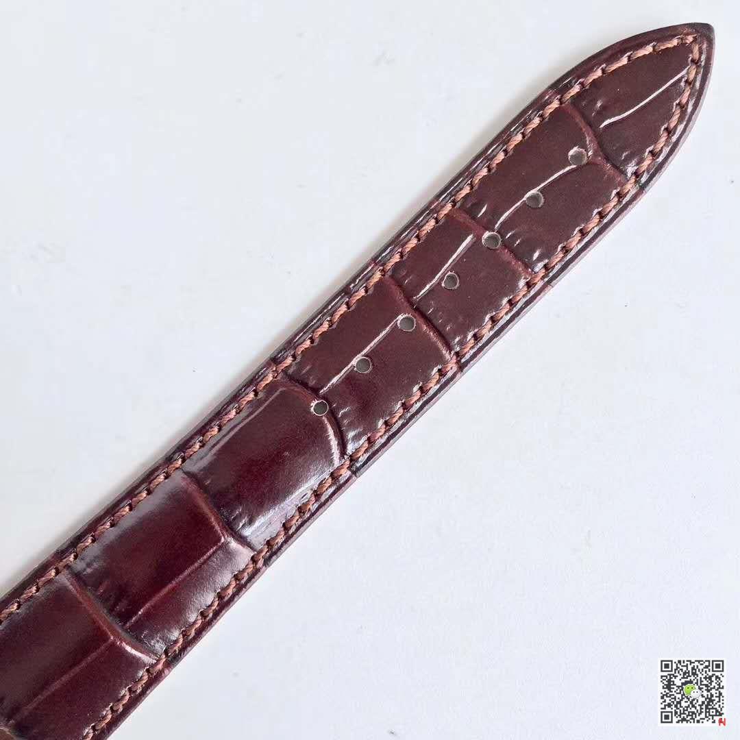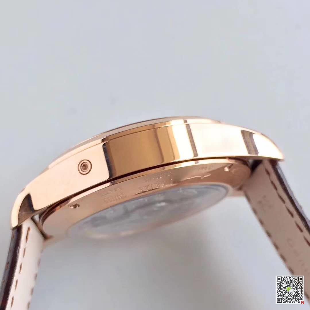 This watch looks very delicate, the blue dial looks noble and elegant, and the overall design is also very simple and harmonious. The 39mm dial just right reveals the light and luxurious temperament that a high-end watch should have, which is very mature and elegant. . The blue sun-decorated dial looks very luxurious. The layout of the various practical functions above is very simple. What is refreshing is that the date display is made into a long pointer style, and the red crescent on the top is very eye-catching. The six o’clock direction is equipped with a moon phase function, which is very attractive for watch lovers who like this function. The second hand scale is placed in a circle around the moon phase window. This design is also very novel. The 18K rose gold case and the blue dial complement each other, and it looks very eye-catching. The fine gear-shaped screw on the crown is polished precisely and is very high-grade. In order to ensure the same size as the original version, the size of the oblique lines of the four corners of the shell surface has been modified many times to perfectly present the three-dimensional and graceful lines of the curved fishtail lines of the lugs.