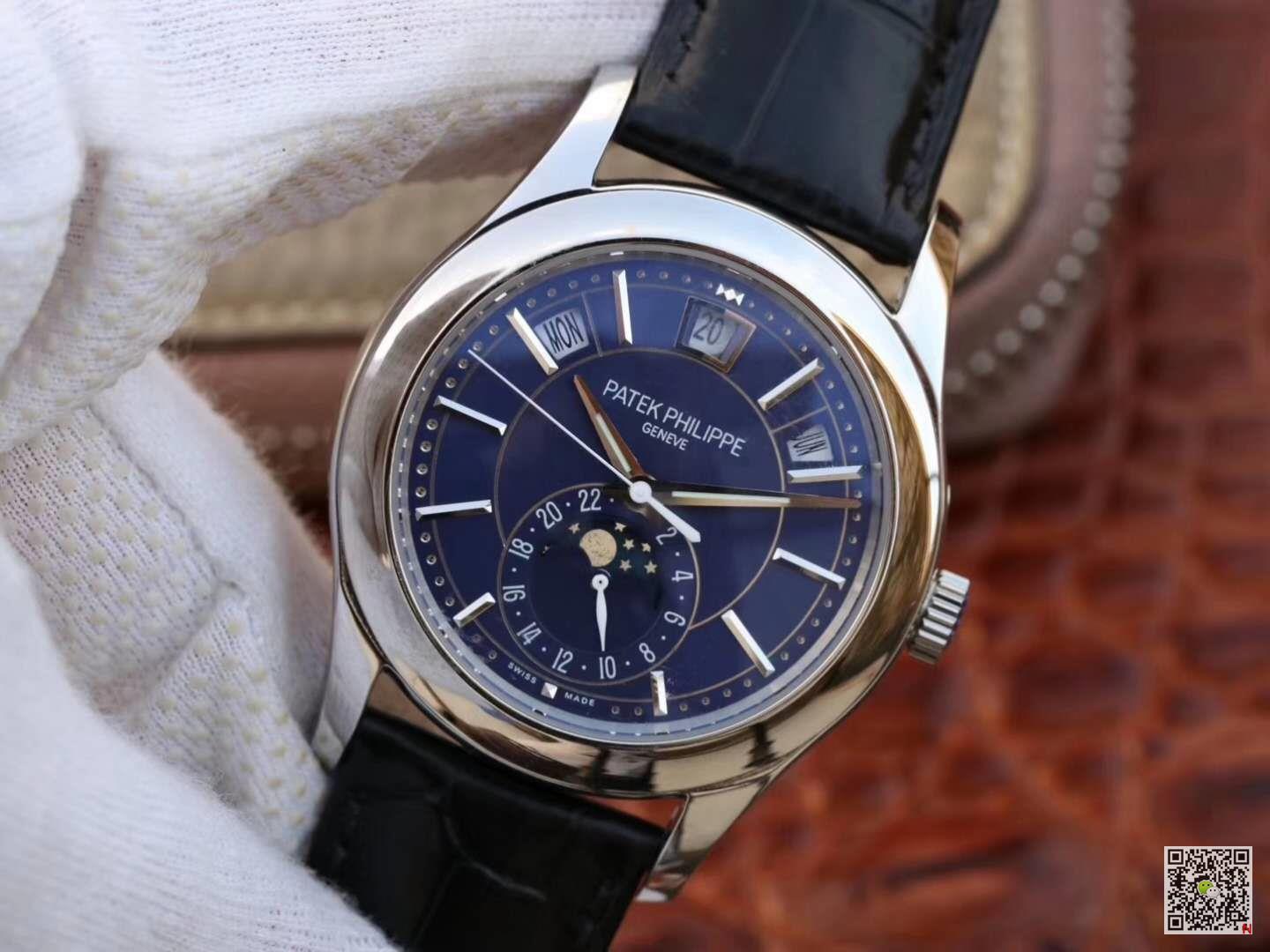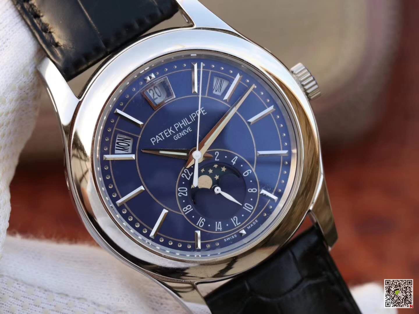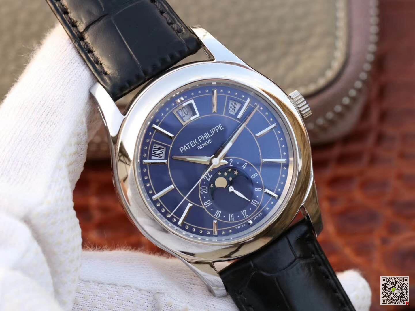 This watch is equipped with three arc-shaped windows to display the week, date and month. This year it is equipped with a new stainless steel dial, which shines with fashionable charm, rhythmic design and modern style, perfectly matched with the three-faceted sword-shaped fluorescent coating Hands and white gold applied hour markers. The annual calendar device can automatically recognize 30-day and 31-day months, and display the week and month; therefore, it only needs to be adjusted once a year at the end of February. Accurate moon phase display is also its convenience, and it will only differ from the actual monthly cycle by one day every 122 years. The 24-hour auxiliary dial at 6 o’clock can simplify the adjustment process of the calendar, and the small pin on the side edge of the case facilitates adjustment of different hands.