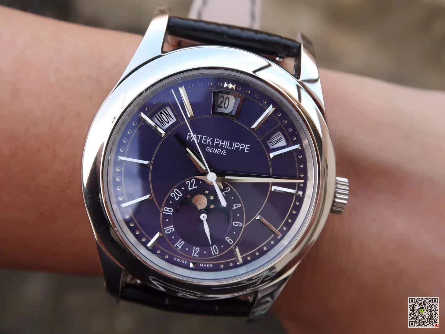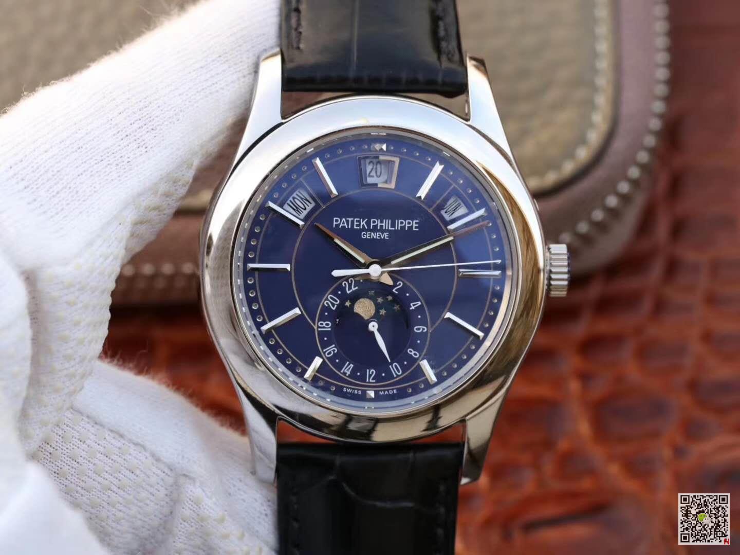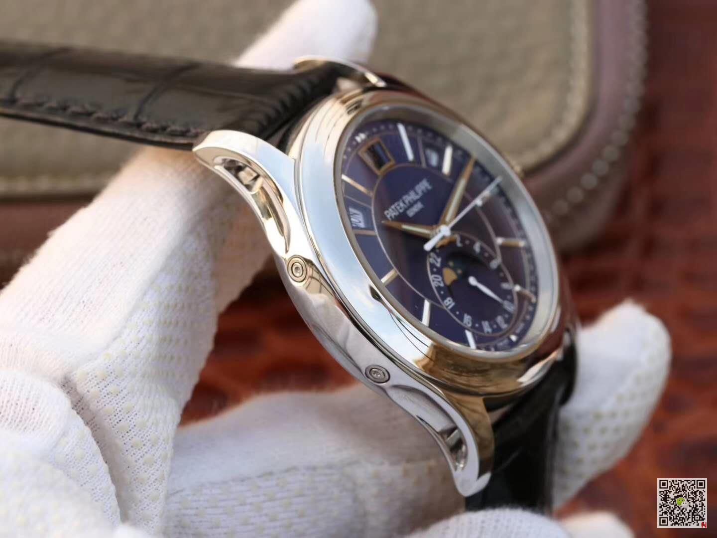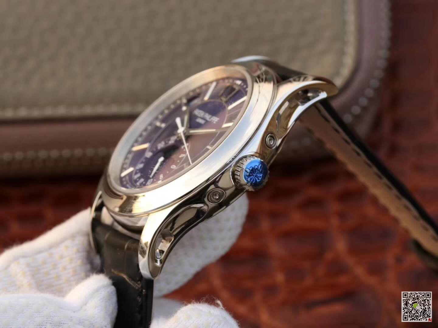This watch is equipped with three arc-shaped windows to display the week, date and month. This year it is equipped with a new stainless steel dial, which shines with fashionable charm, rhythmic design and modern style, perfectly matched with the three-faceted sword-shaped fluorescent coating Hands and white gold applied hour markers. The annual calendar device can automatically recognize 30-day and 31-day months, and display the week and month; therefore, it only needs to be adjusted once a year at the end of February. Accurate moon phase display is also its convenience, and it will only differ from the actual monthly cycle by one day every 122 years. The 24-hour auxiliary dial at 6 o’clock can simplify the adjustment process of the calendar, and the small pin on the side edge of the case facilitates adjustment of different hands.