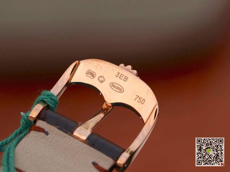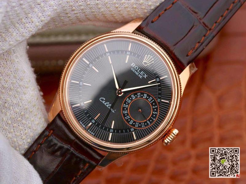 In addition to displaying hours, minutes and seconds, Cellini Date 50515 Replica Watches has also added a calendar display function, fully displaying its elegant style, prominent tradition and full poetry. The black dial has a small gold-rimmed sub-dial with a radial pattern in the center at 3 o’clock, showing the complete sequence of the month’s date. As with old clocks, the hands indicate the current date day after day. This calendar display is set on a single dial, allowing the wearer to keep track of the time in different regions. With just a glance, the time of two places can be read at the same time.